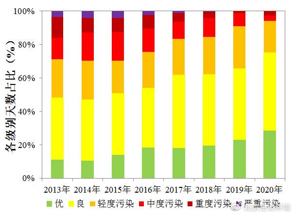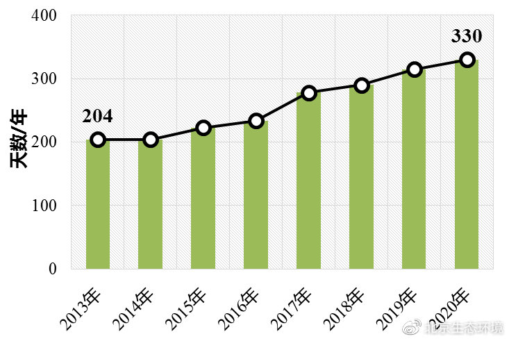 “藍(lán)天”含金量持續(xù)提升。2020年,PM2.5為優(yōu)良的天數(shù)達(dá)到330天,占全年總天數(shù)的90.2%,較2013年增加126天,相當(dāng)于2020年平均每周7天中就有6.3天為PM2.5優(yōu)良天,而在2013年僅不到4天。